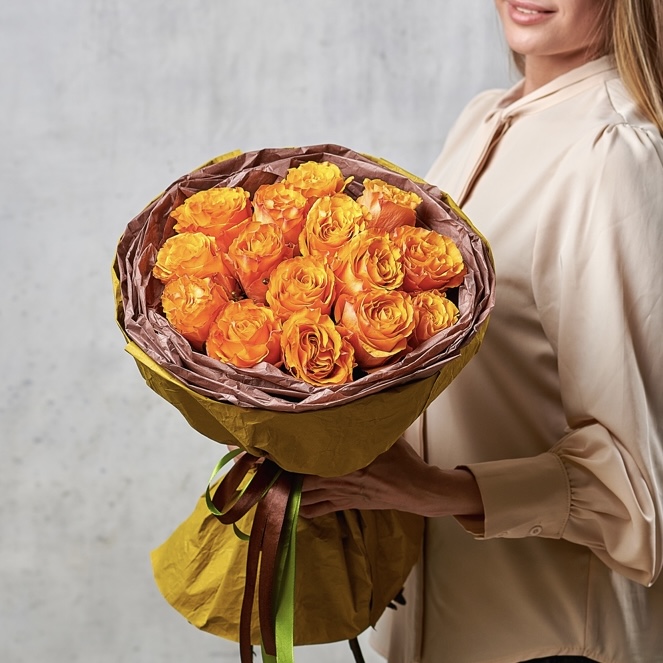 Оранжевые цветы символизируют успех, творчество и счастье. Букет оранжевых роз станет отличным подарком любимым, коллегам или друзьям. Круглая упаковка подчеркнет форму каждого бутона. Возможны небольшие изменения элементов. Общий вид и композиция букета будет сохранена.