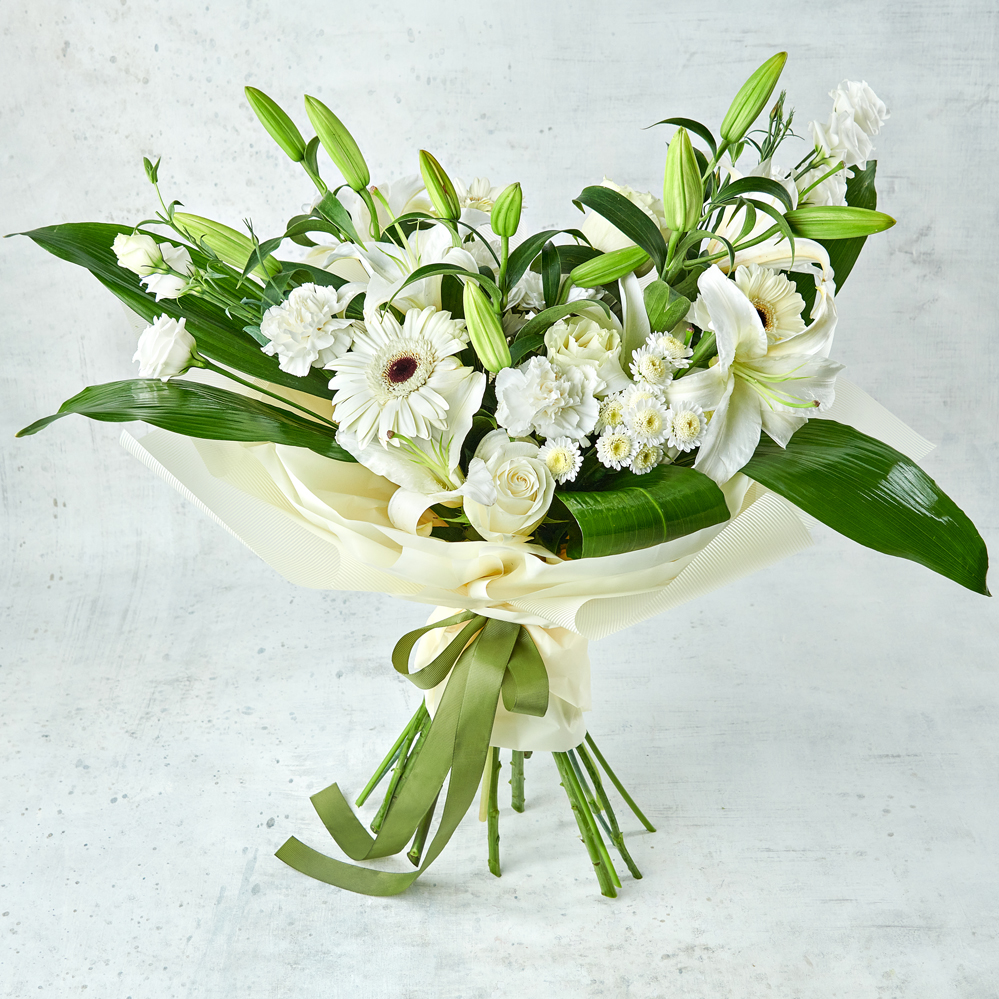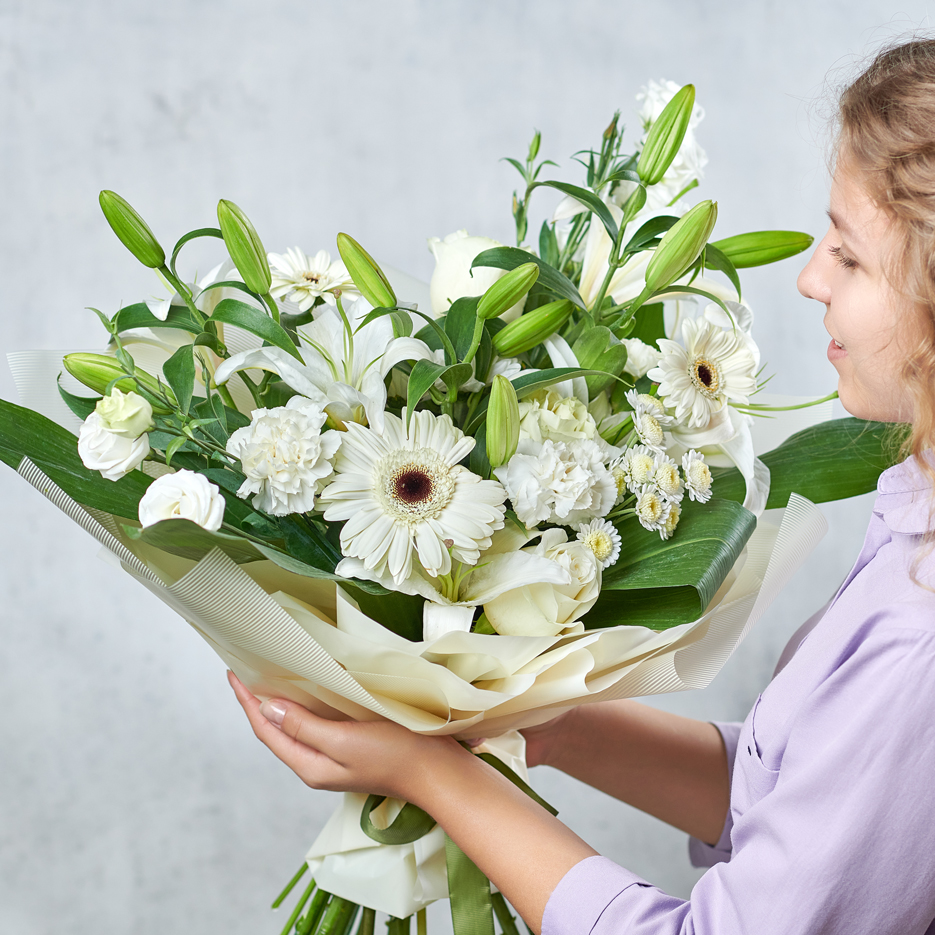 Белоснежный букет, стойкий состав и невероятная зелень. Подарите близким свежие эмоции с ароматными лилиями. Возможны небольшие изменения элементов. Общий вид и композиция букета будет сохранена.