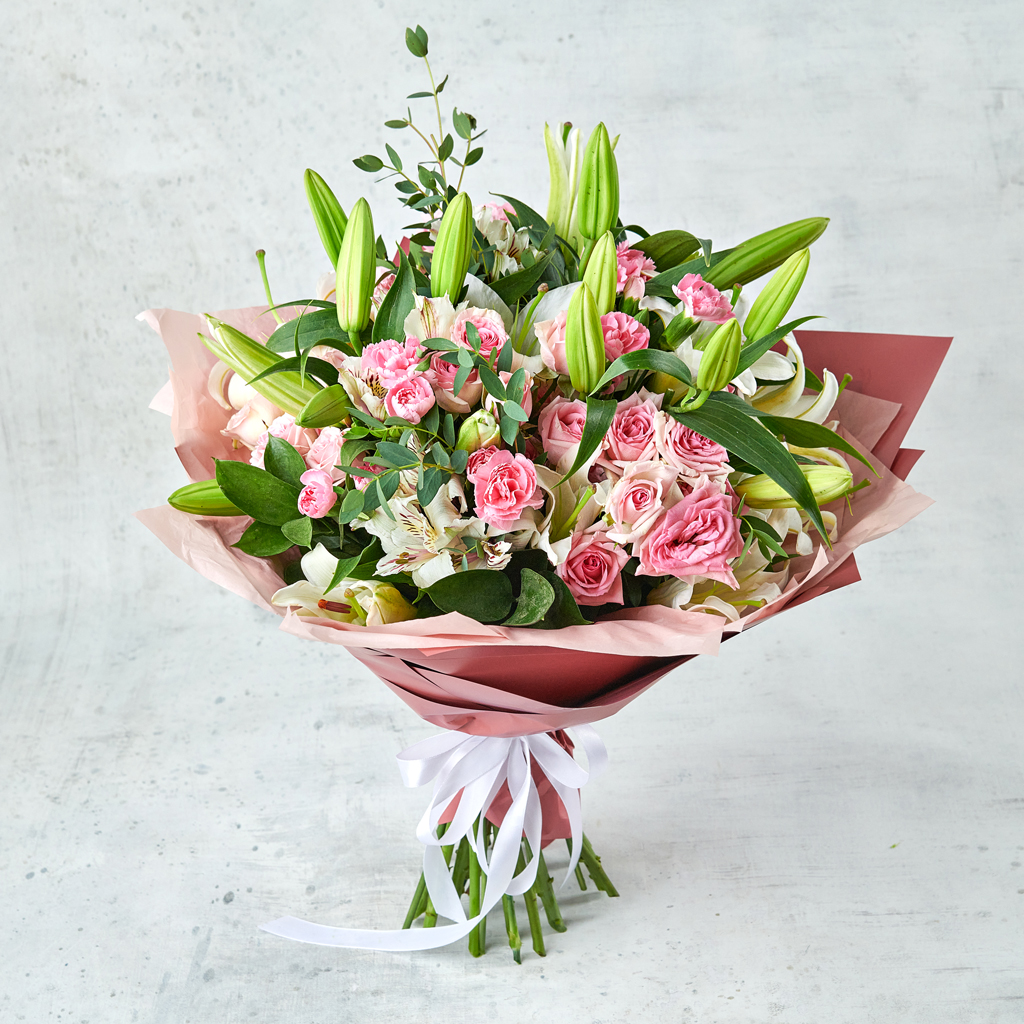 Кустовая роза, романтичная белоснежная лилия, эвкалипт, подчеркивающий каждую деталь. Такой набор прекрасно подойдет как юным девушкам, так и взрослым дамам. Классическая упаковка, универсальная цветовая гамма - подарок, выбранный со вкусом. Возможны небольшие изменения элементов. Общий вид и композиция букета будет сохранена.