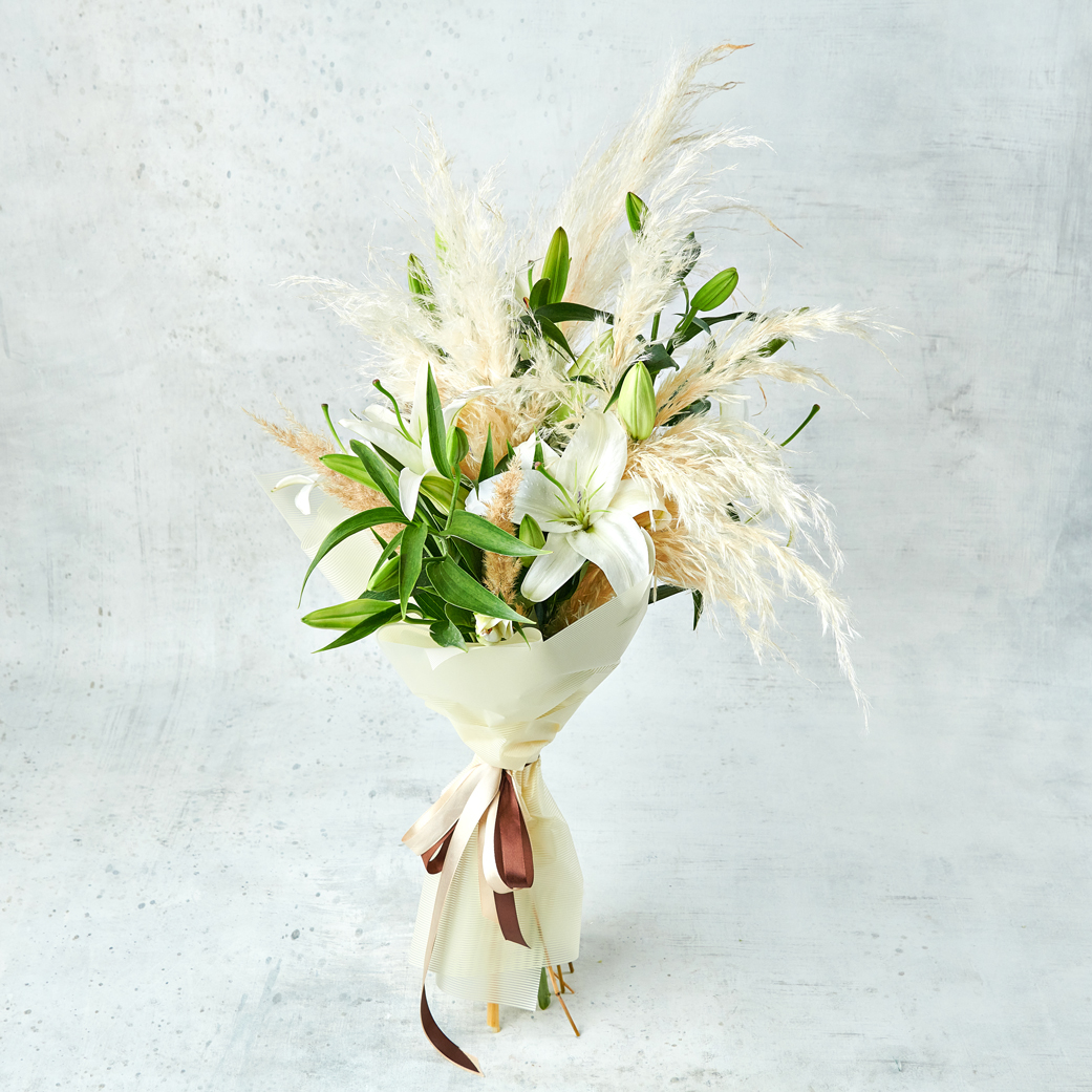Лилия - один из самых благородных цветов. Ее в качестве своего символа выбирали короли. В сочетании с пышной кортадерией лилия создает изящный вытянутый силуэт. Трендовые перья и воздушная упаковка - безупречный подарок для настоящих эстетов. Возможны небольшие изменения элементов. Общий вид и композиция букета будет сохранена.