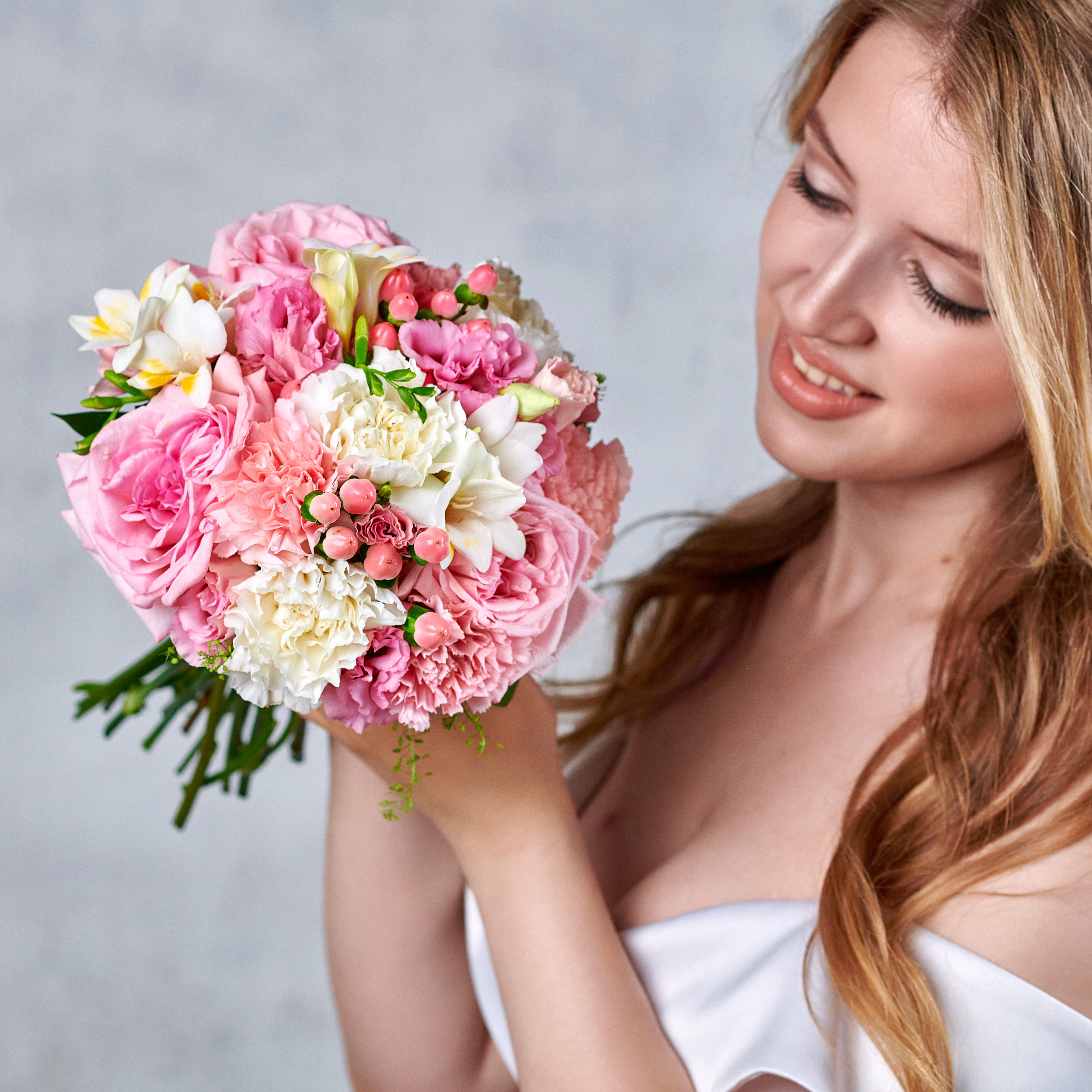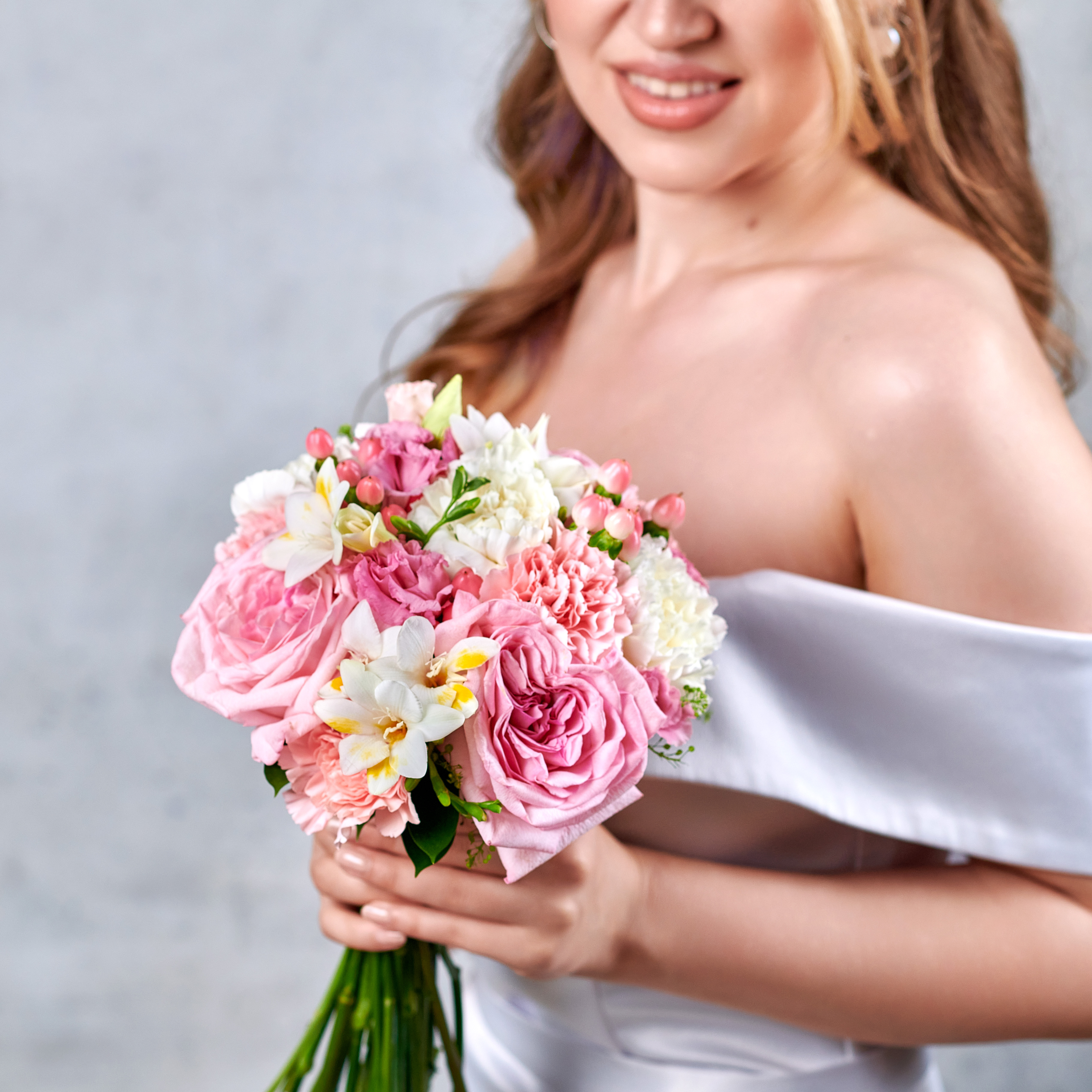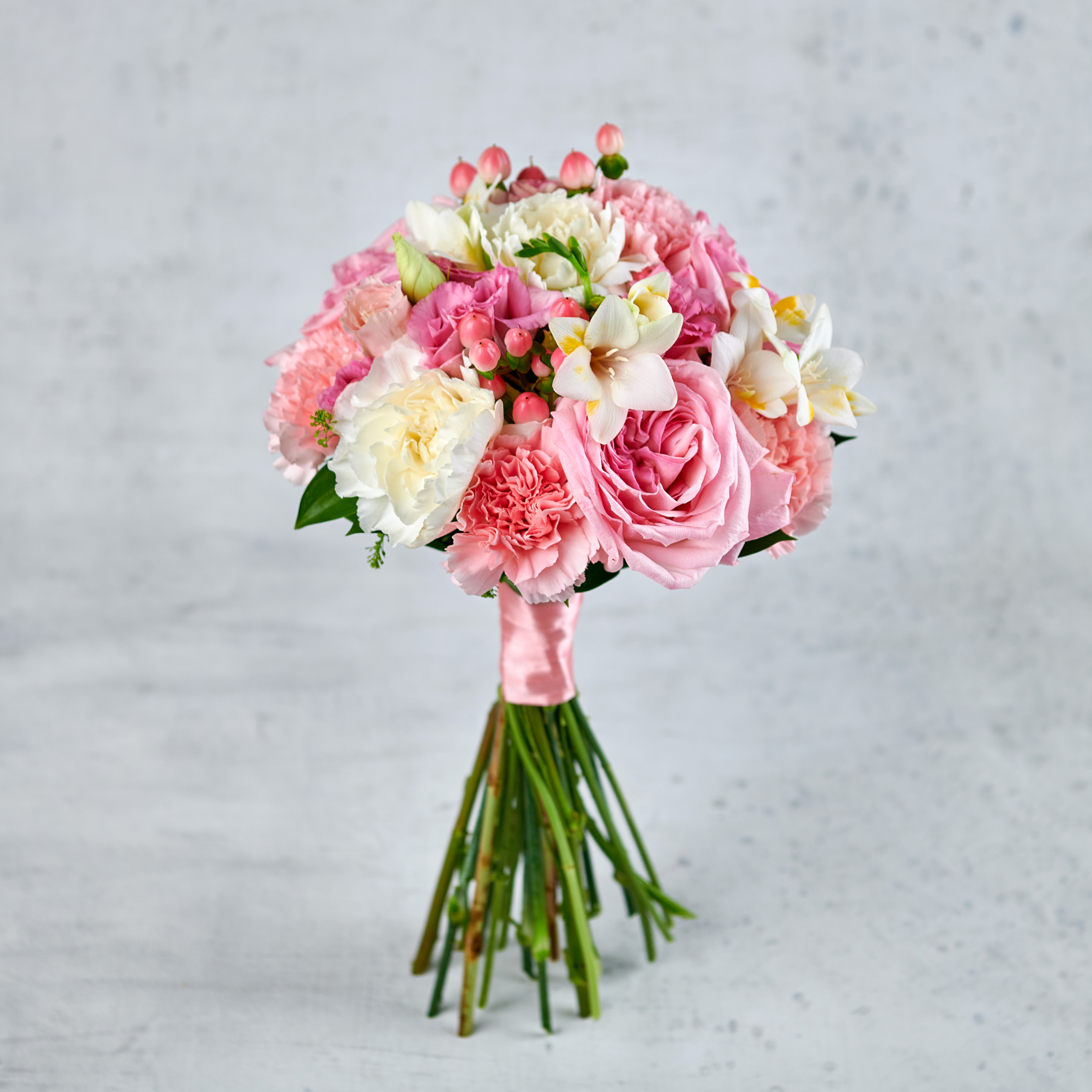 Классический свадебный букет с богатым благородным составом, розы подчеркнут красоту, фрезия придаст аромат, а нежные лепестки изящных гвоздик подчеркнут особую важность каждой минуты. Возможны небольшие изменения элементов. Общий вид и композиция букета будет сохранена.