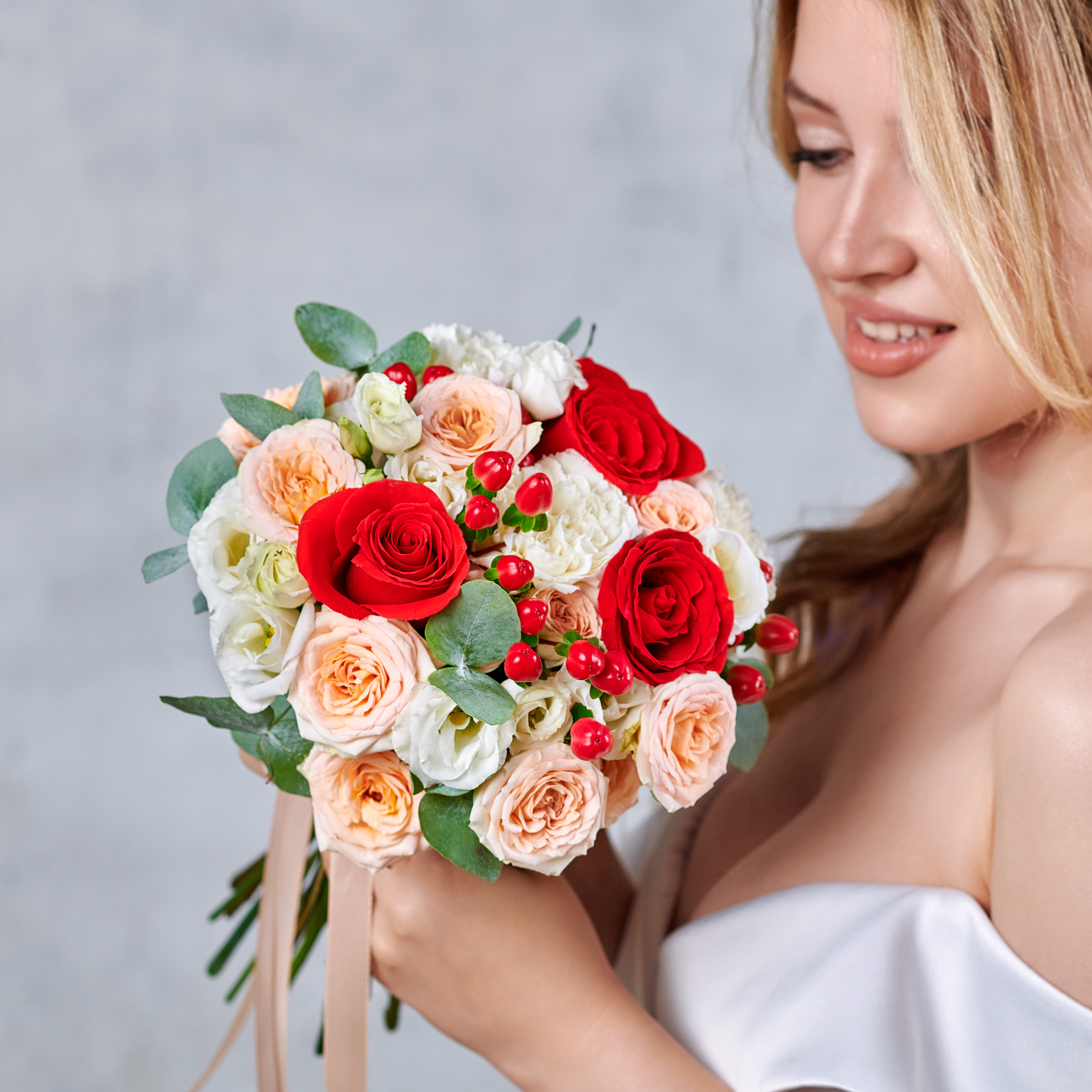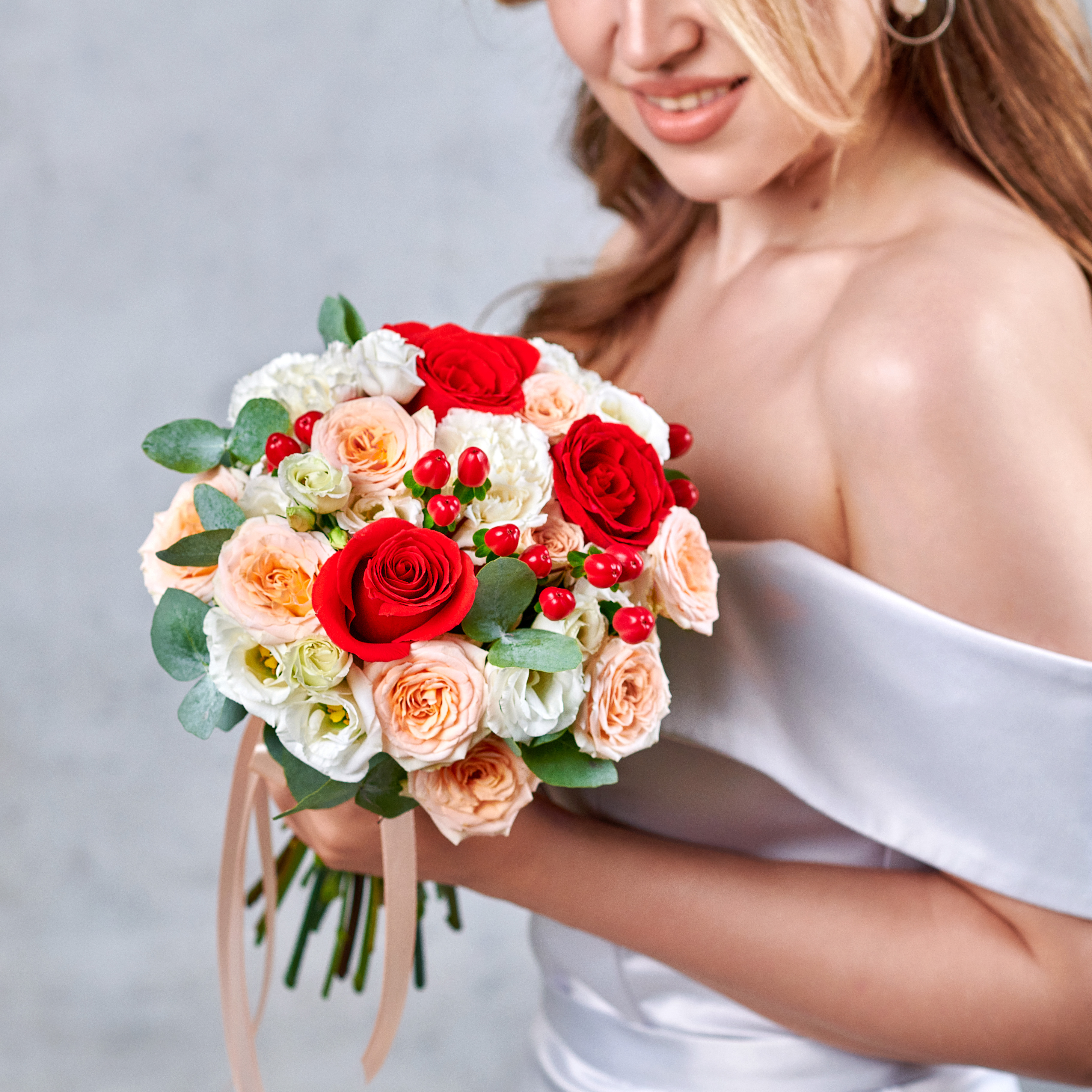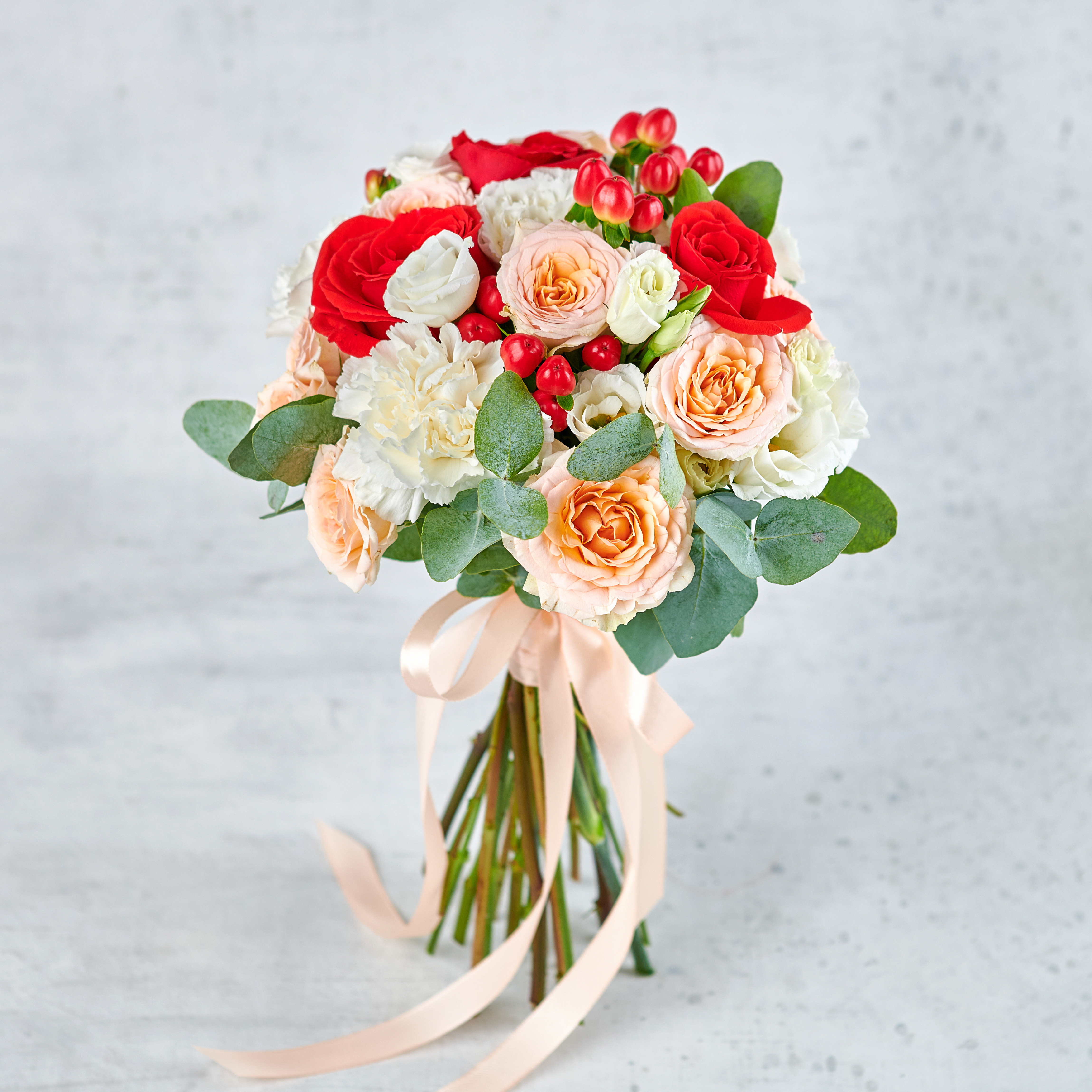 Изящная классика с ягодными акцентами. Прекрасно подчеркнет яркость и индивидуальность невесты, а нежные розы отразят шарм и нежность свадебных улыбок. Возможны небольшие изменения элементов. Общий вид и композиция букета будет сохранена.