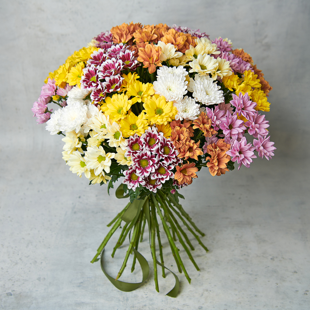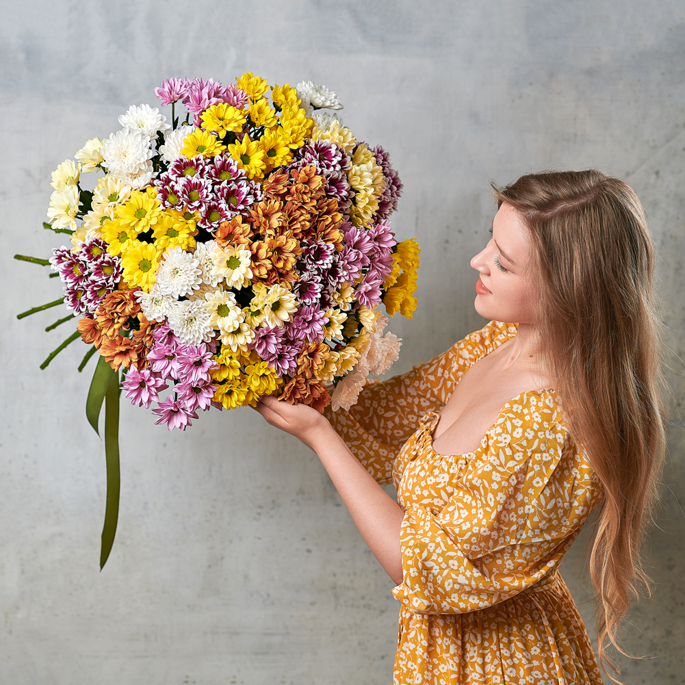 Пышное облако самых хрустящих и солнечных цветов на свете - букет, о котором мечтает каждая. Хризантема славится своей стойкостью, пышными соцветиями, символизирует счастье и процветание. Возможны небольшие изменения элементов. Общий вид и композиция букета будет сохранена.