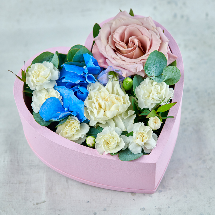 Коробочка в форме сердца с самыми нежными цветами поможет выразить глубокие чувства. Возможны небольшие изменения элементов. Общий вид и композиция букета будет сохранена.