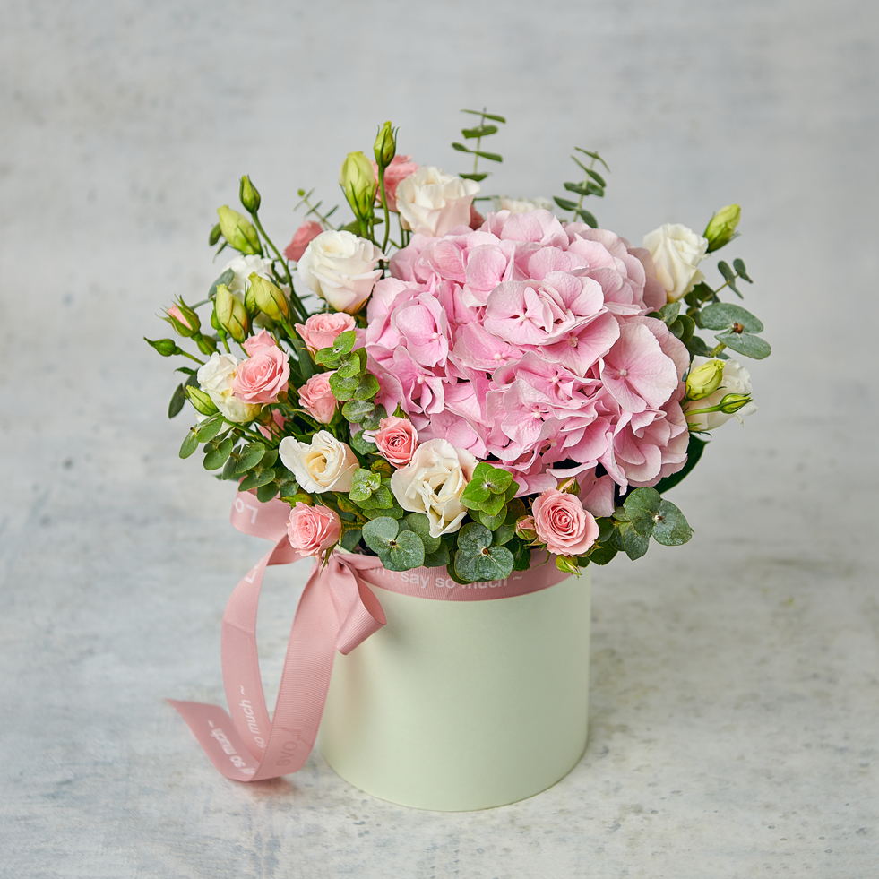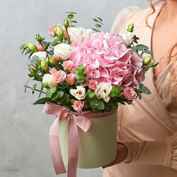 Цветущий сад. Гортензия - любовь всех девушек. Эти чудесные цветочные облака станут безупречным подарком для всех мечтательниц. Возможны небольшие изменения элементов. Общий вид и композиция букета будет сохранена. В составе присутствует сезонный цветок, который может быть заменен, исходя из наличия товара.