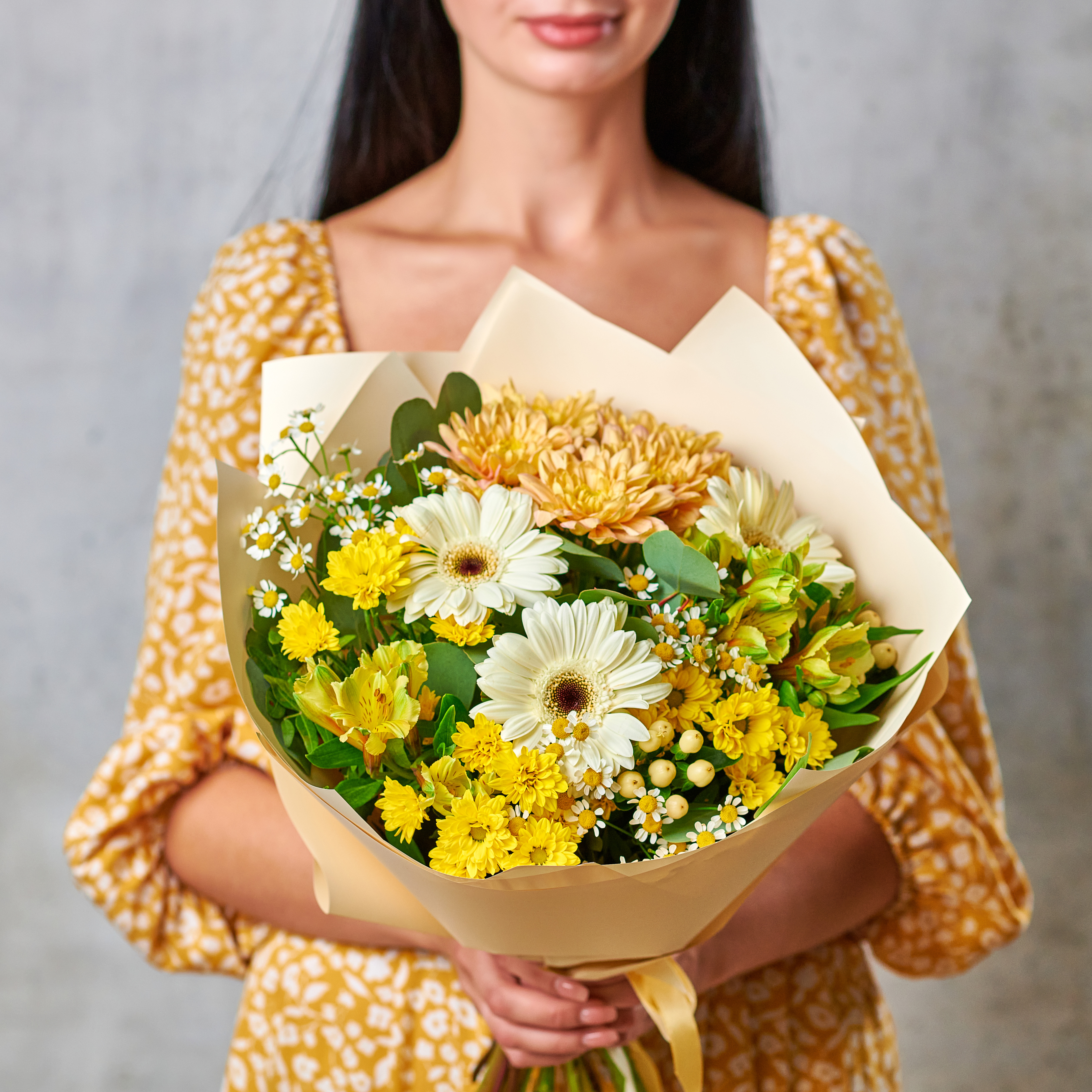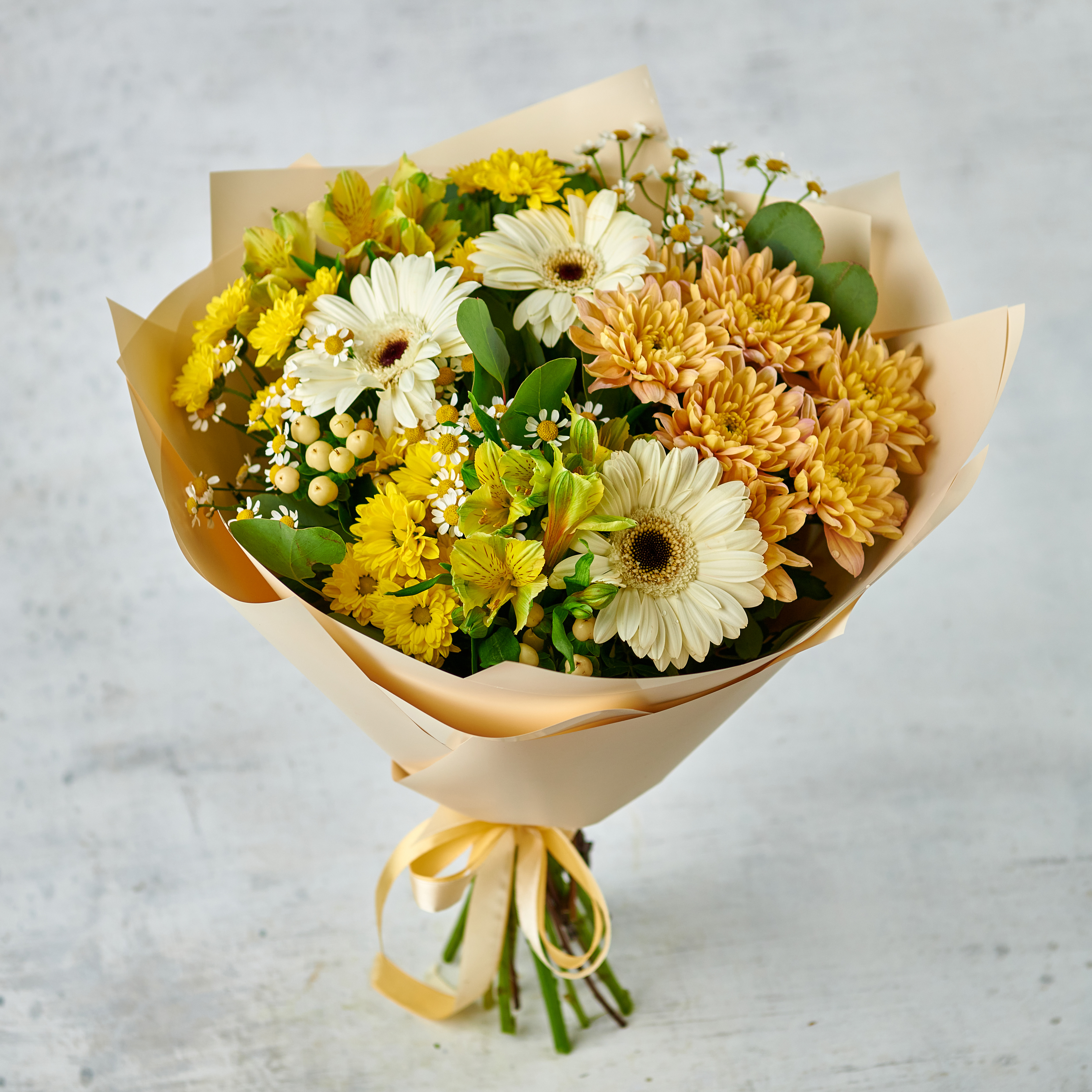 Поймали солнечные лучи в самый теплый букет. Ромашки, любовь и теплота полей в нежной упаковке станут отличным подарком для любого повода. Возможны небольшие изменения элементов. Общий вид и композиция букета будет сохранена.