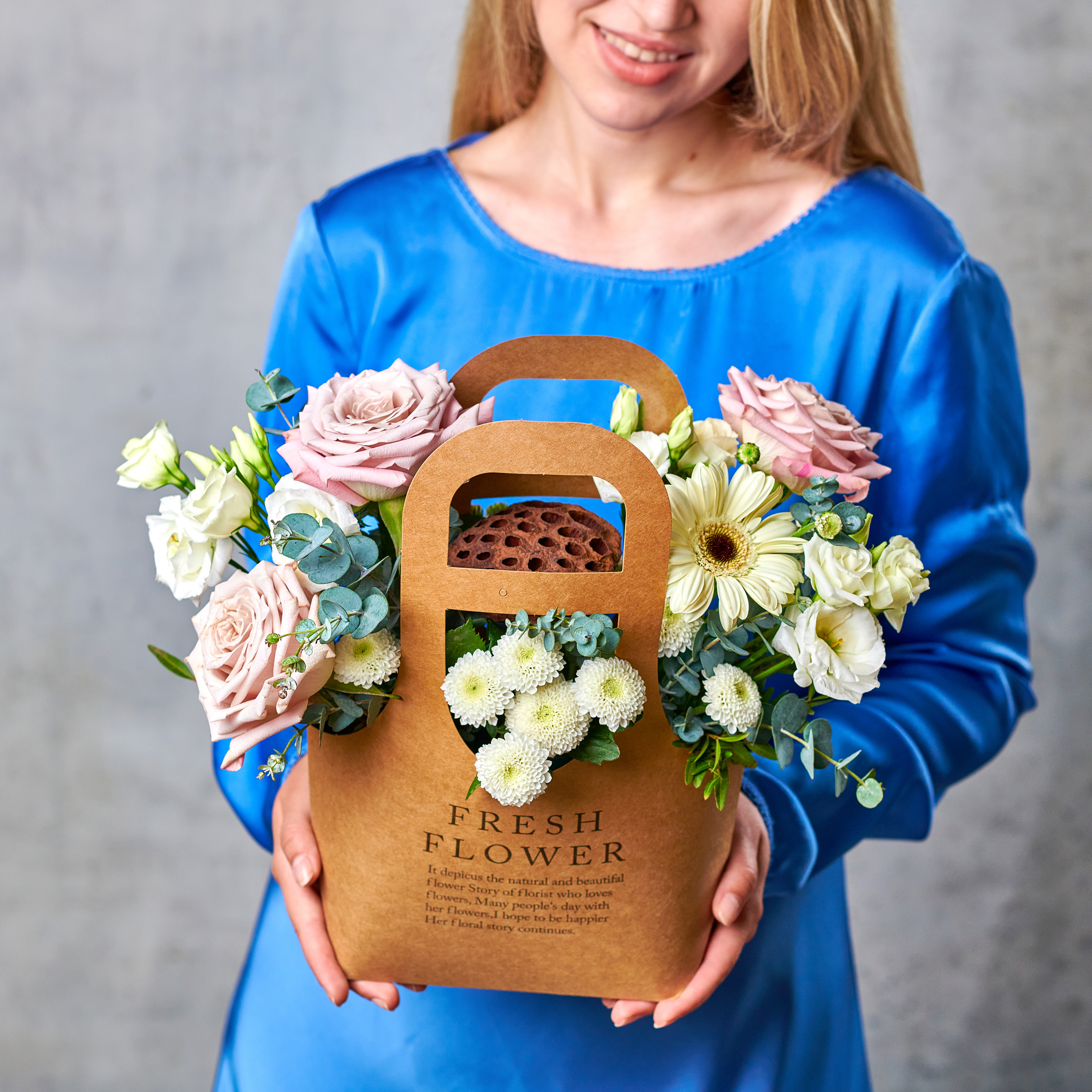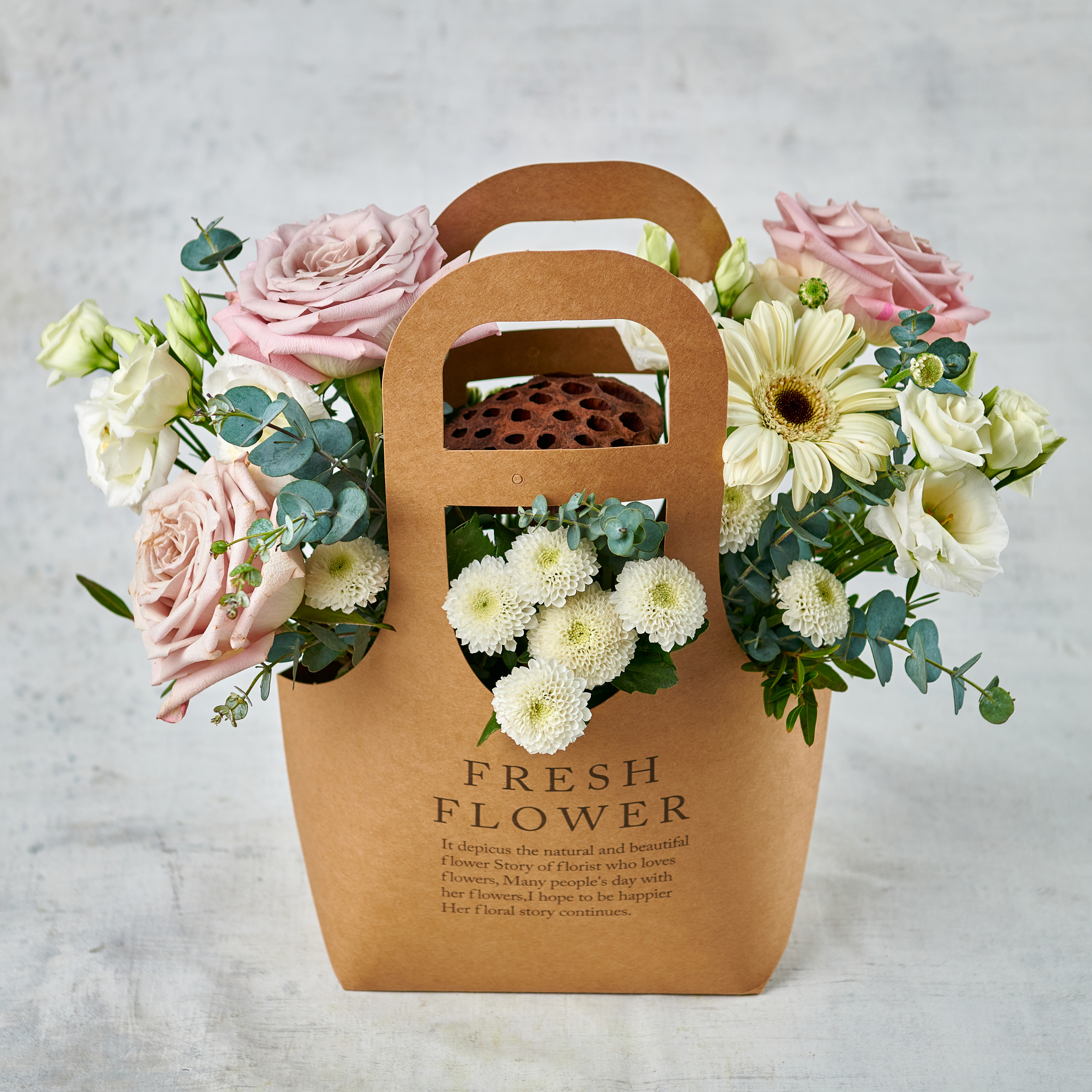 Изящная коробочка лотоса, пудровые розы и ароматный эвкалипт подарят незабываемое ощущение праздника и торжественности в любой день. Возможны небольшие изменения элементов. Общий вид и композиция букета будет сохранена.