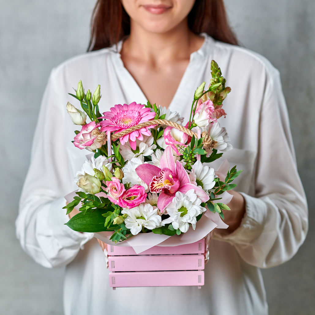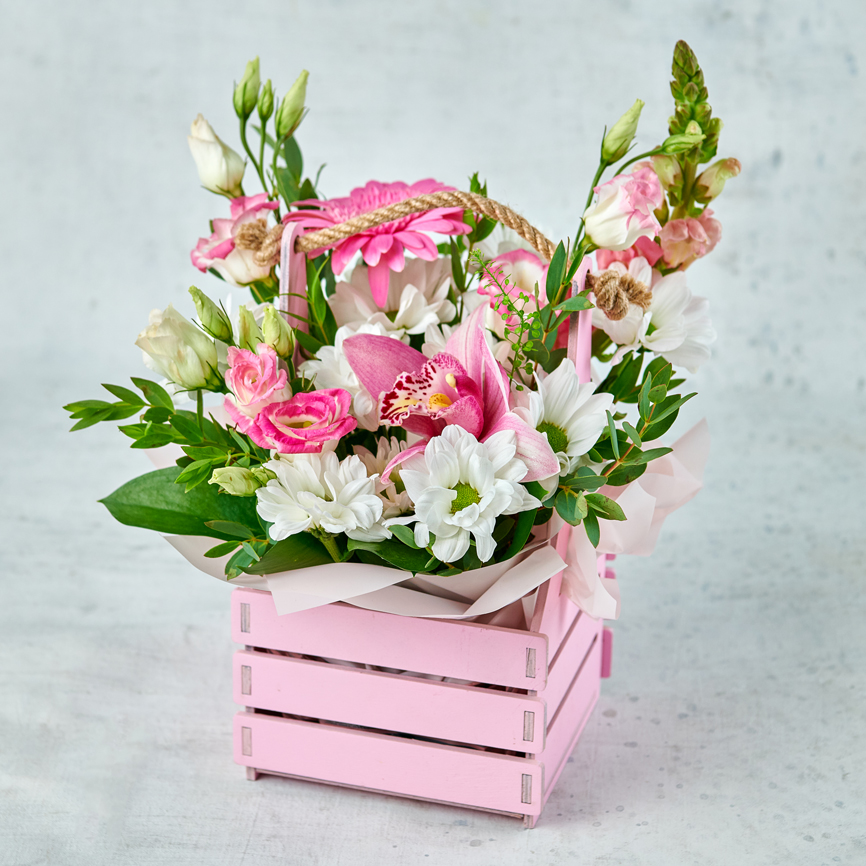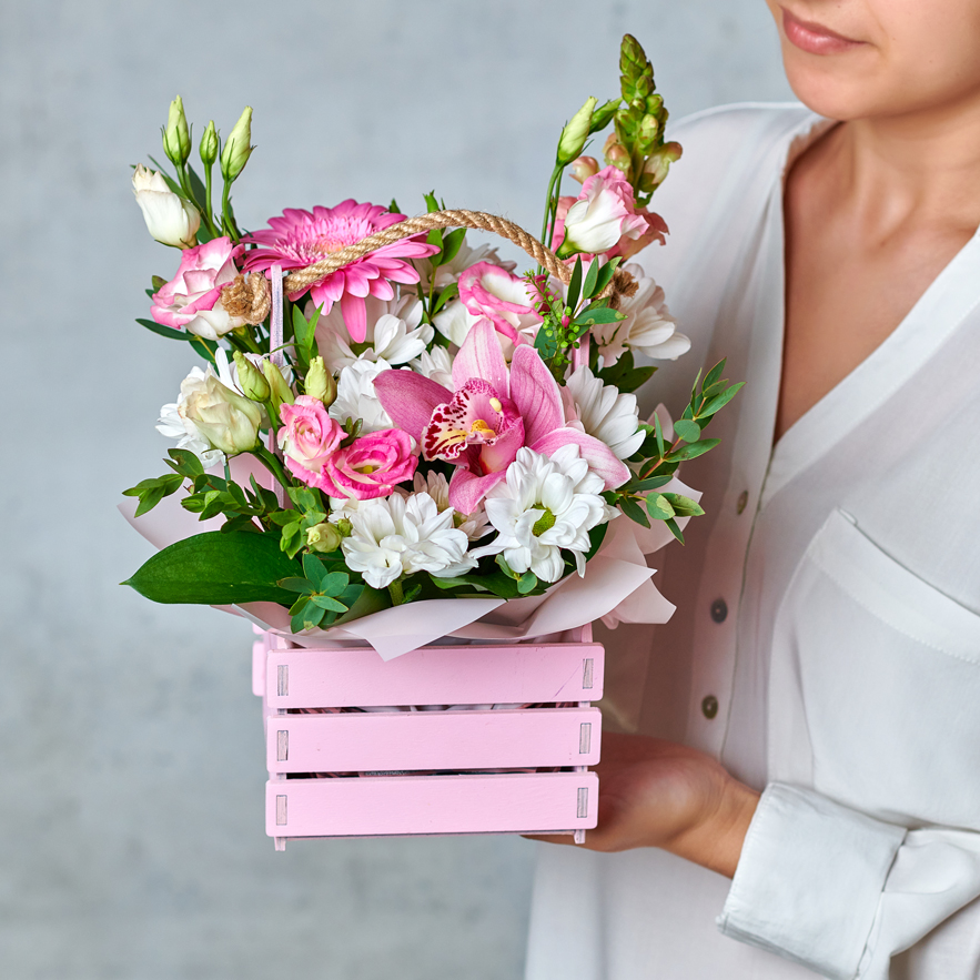 Розовые мечты, которые покорят и вдохновят. Композиция выполнена из нежнейших хризантем и тропической орхидеи, обрамленной благородной зеленью. Возможны небольшие изменения элементов. Общий вид и композиция букета будет сохранена.
