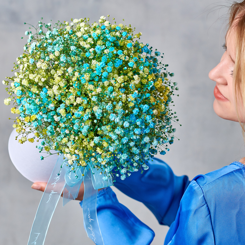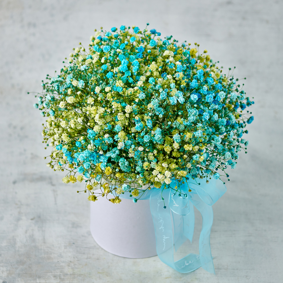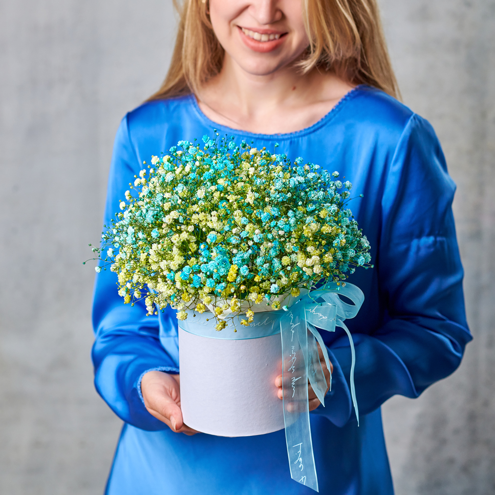 Пышное облако ярких искр из гипсофилы в шляпной коробке и с задорной лентой. Возможны небольшие изменения элементов. Общий вид и композиция букета будет сохранена.
