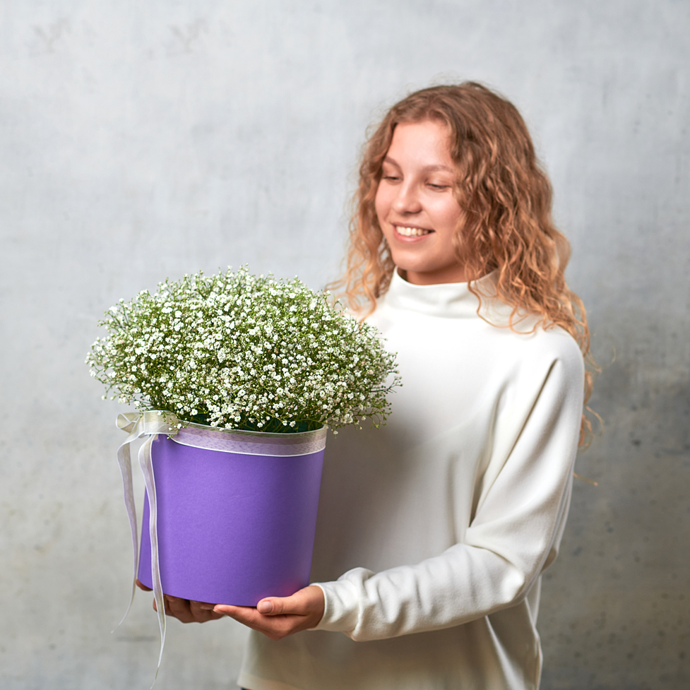 Настоящий хит цветочных подарков - снежная гипсофила. Такой подарок точно вызовет восторг и будет радовать получателя очень долго, так как гипсофила сохраняет свой вид даже после высыхания, нередко используется в качестве сухоцвета и декоративного элемента. Возможны небольшие изменения элементов. Общий вид и композиция букета будет сохранена.