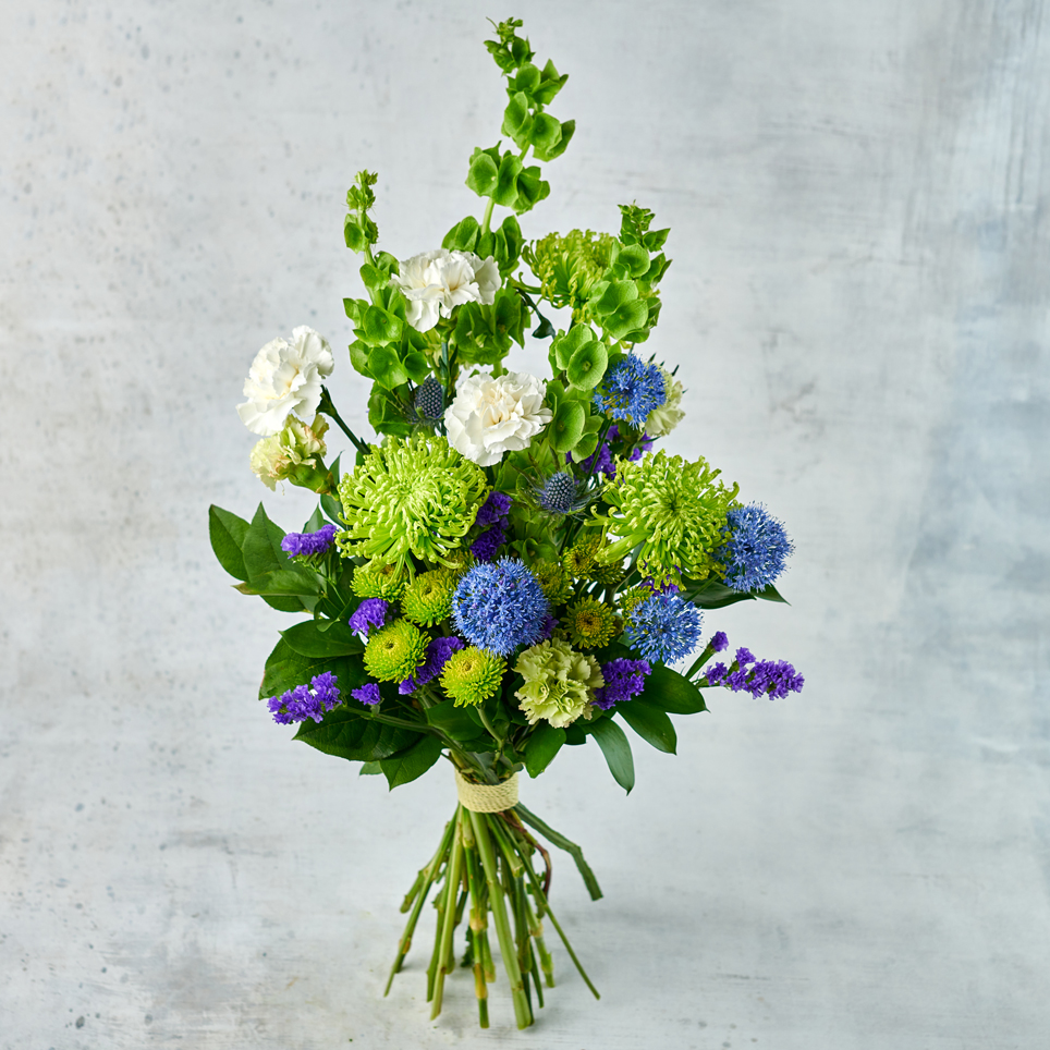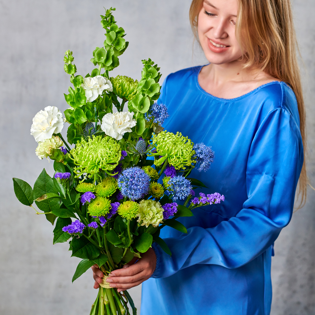Букет соткан из самых разнообразных фактур, дышащих свежестью и ароматами сочной зелени. Каждый цветок стремится ввысь, а утонченная форма сужается в естсественном распаде лепестков. Такой букет прекрасно подойдет как мужчинам, благодаря благородной вытянутой форме и сдержанным оттенкам, так и представительницам женского пола. Возможны небольшие изменения элементов. Общий вид и композиция букета будет сохранена.