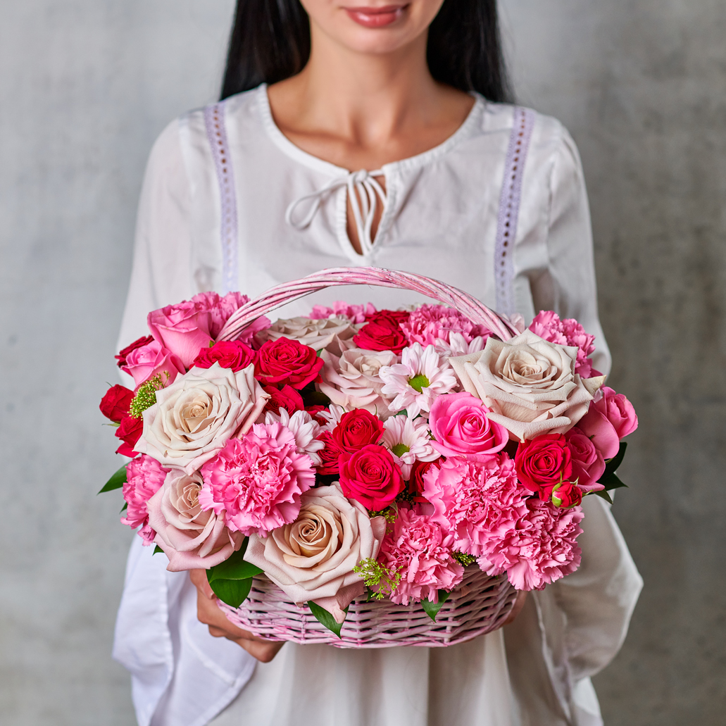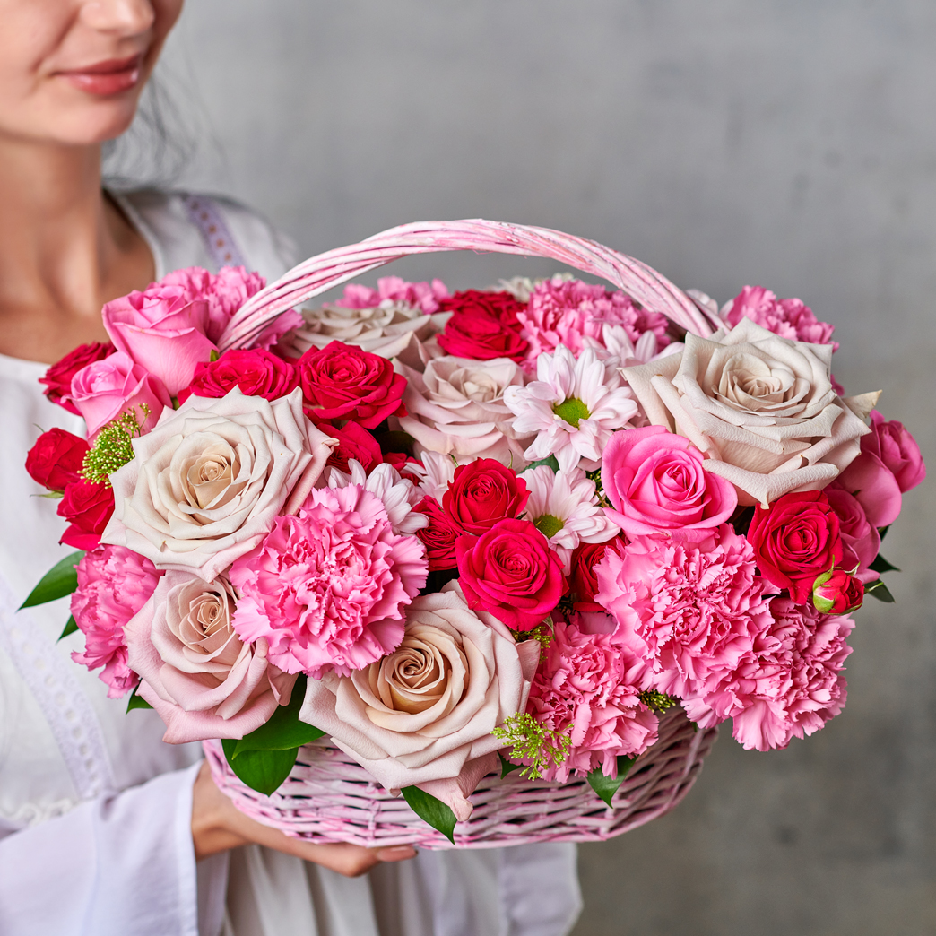 Розовый сад в полном цвету. Великолепие универсальной палитры в самом классическом и изящном исполнении. Идеальный подарок для тех, кто так любит восхищать. Возможны небольшие изменения элементов. Общий вид и композиция букета будет сохранена.