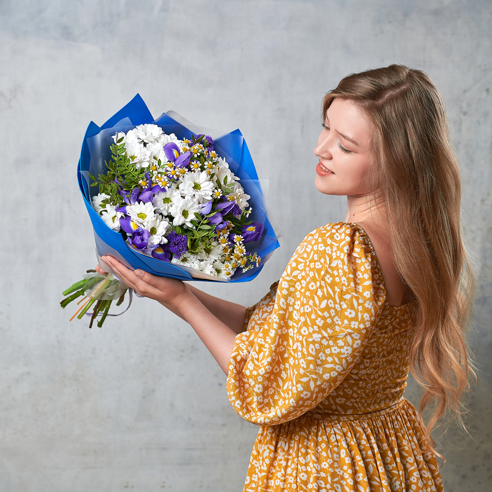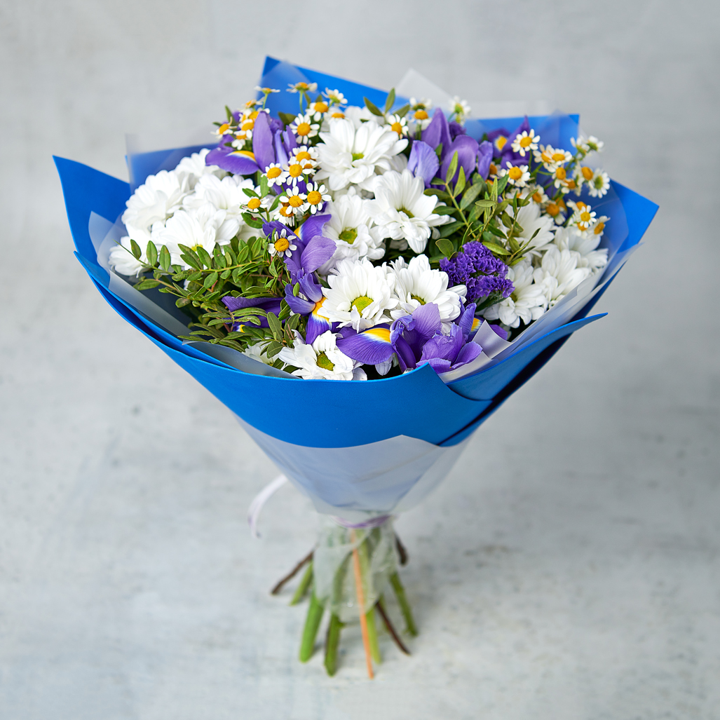 Букет цвета майского неба - мечта, перед которой сложно устоять. Нежные ирисы и белоснежная хризантема будто созданы друг для друга, а россыпь капель ромашек вдохновит на новые открытия. Возможны небольшие изменения элементов. Общий вид и композиция букета будет сохранена.