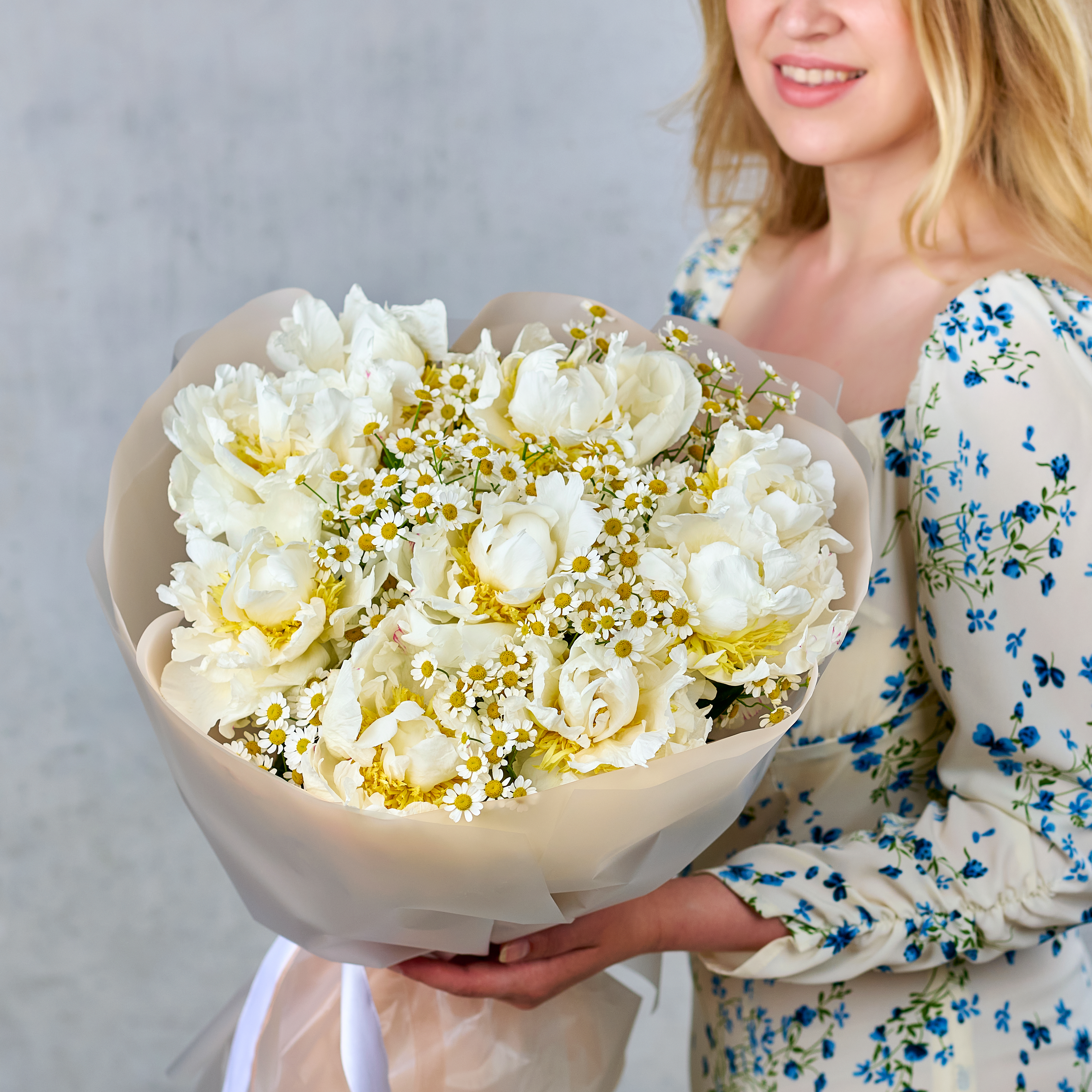 Летний изысканный букет из пионов, ромашек - сочетание, способное вскружить голову. Воздушная упаковка, классическая форма и утонченный аромат - рецепт идеального подарка. Обратите внимание, что пион - сезонный цветок, при необходимости менеджер может предложить замену, исходя из наличия товара.