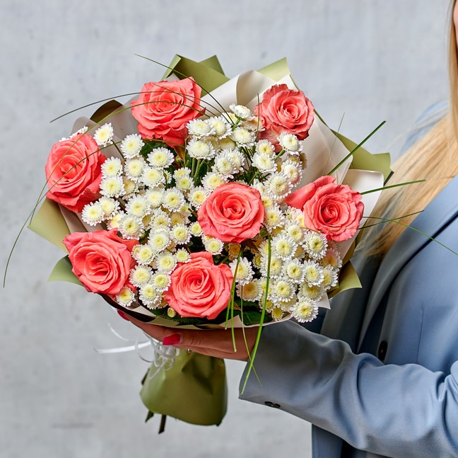 Волшебные бутоны, подчеркнутые белоснежной хризантемой создадут незабываемый контраст, оформленный в натуральный благородный глубокий зеленый оттенок. Идеальный букет, который подойдет для любого повода. Возможны небольшие изменения элементов. Общий вид и композиция букета будет сохранена.
